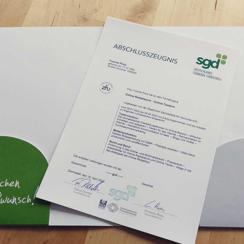 Seit 2,5 Jahren bin ich eine selbstständige Texterin. Durch mein Studium an der sgd habe ich mich auf das Verfassen von Online-Texten spezialisiert.